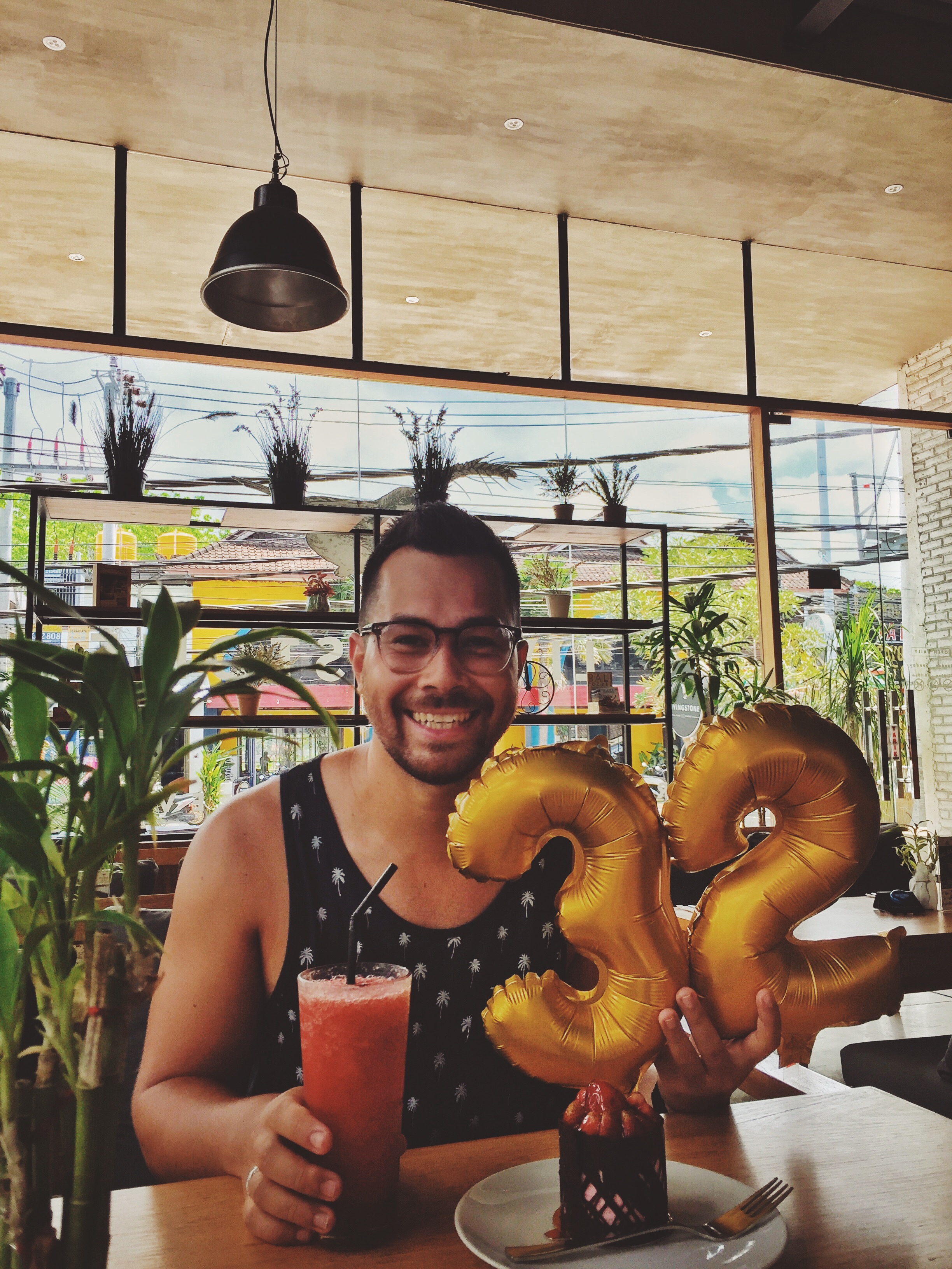Voor het tweede jaar op rij je verjaardag vieren op Bali is natuurlijk al een feestje op zich. Maar als je 32 zomers jong bent, dan horen daar ook ballonnen bij en mag iedereen zien dat je 32 geworden bent ?. Dus vanuit Nederland waren de cijferballonnen stiekem de tas mee ingegaan en werden deze ochtend tevoorschijn getoverd. Het feestje kon beginnen! Maar zoals de spreuk luidt: ‘a party without a cake is just a meeting’. Dus we zijn, met de ballonnen mee in de tas ?, ’s ochtends naar een koffietentje gegaan en hebben daar een heerlijk taartje gegeten. Ook daar hebben ze geweten dat er iemand jarig was ?.