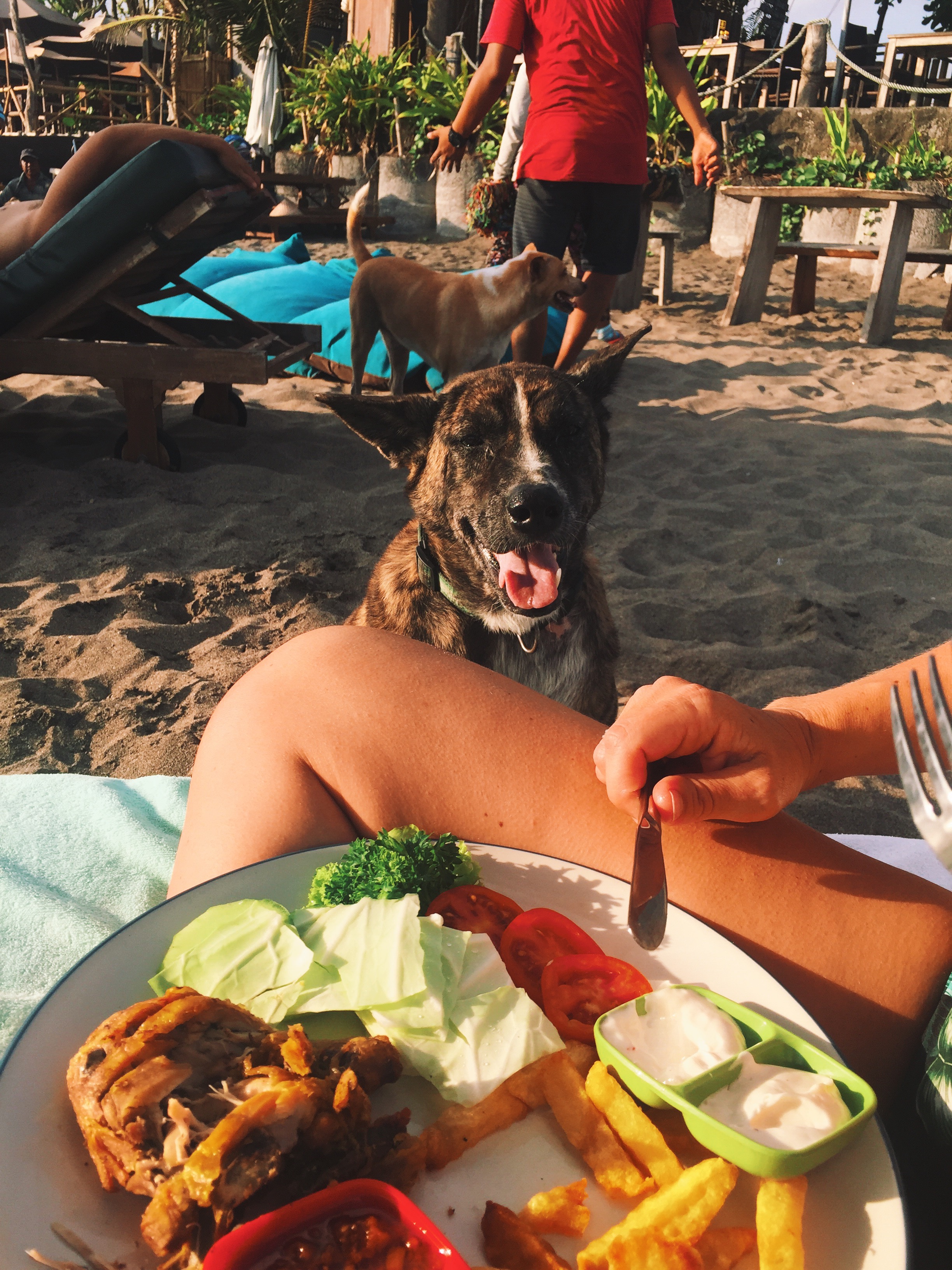 Na het overweldigende verjaardagsfeest zijn we de dag erna ’s ochtends aan het strand wezen loungen met een kop koffie en een vers sapje. Muziekje aan, languit in de zitzak en op naar een paar verbrandde onderbeentjes van het ochtendzonnetje ?. In de middag zijn we daarom maar niet gaan bakken op de ligbedjes, maar hebben we een lang stuk over strand gewandeld tot het volgende dorpje Canggu. Onderweg de hippe beachclub Finns gespot (wat een massatoerisme!) en nog een aantal bruidsreportages (er trouwen hier wel erg veel stellen op het strand als we de jurken moeten geloven ?).