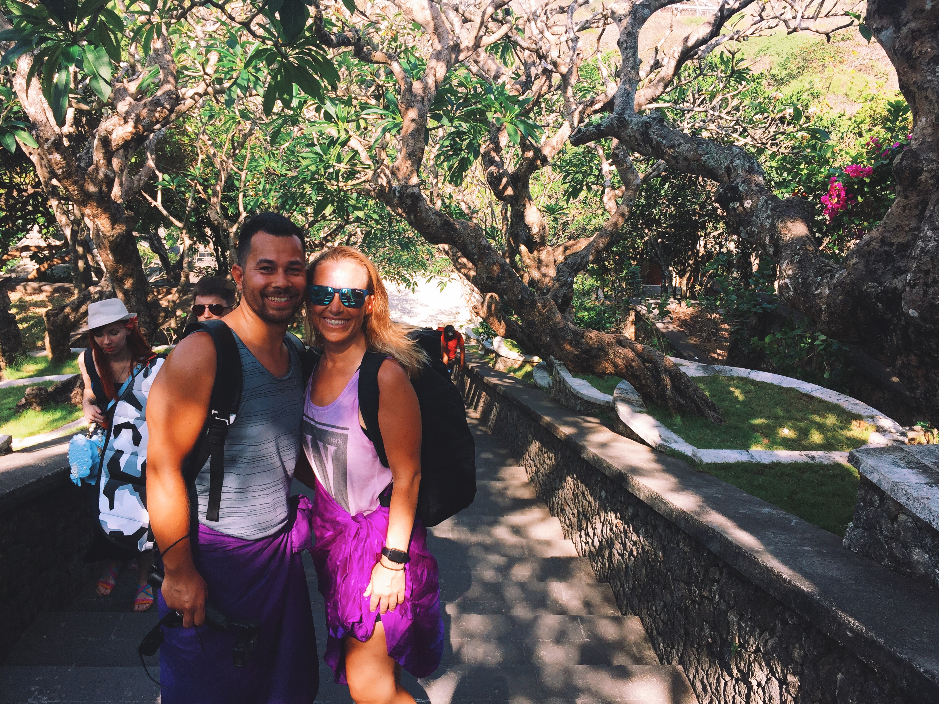 Na wat rondgedarteld te hebben op dit hemelse plekje, hebben we onze route vervolgd en zijn we richting de Hindoeïstische Uluwatu Tempel gereden. Achteraf gezien hebben we blijkbaar de entree gemist, want we zijn zonder toegangskaartje binnen gekomen ?. Wel was het verplicht om een sarong van de stapel te pakken en te dragen, dus met onze rokken zijn we in de menigte opgegaan. Het tempelpark ligt op een klif, wat een schitterend uitzicht geeft. De rondlopende aapjes maken de tempel wat attractiever, want verder is het (voor ons) niet heel bijzonder.